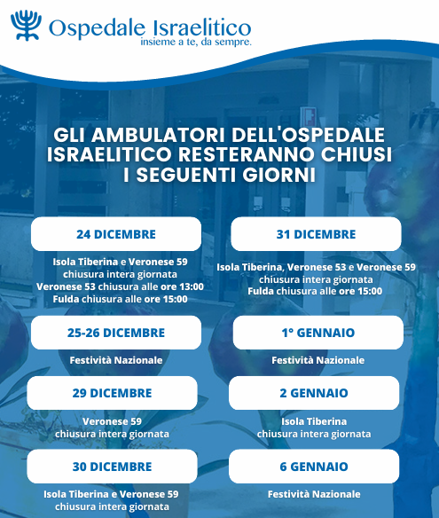 Informiamo i nostri pazienti che l’attivitร  ambulatoriale dell’Ospedale Israelitico subirร  le seguenti variazioni nei mesi di dicembre e gennaio: