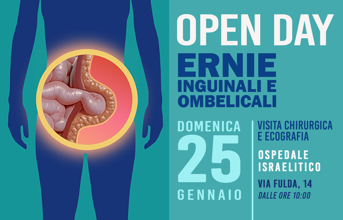 Le ernie inguinali e ombelicali sono condizioni molto comuni, che possono manifestarsi con gonfiore, fastidio o dolore, soprattutto durante sforzi, tosse o attività quotidiane. Spesso tendono a peggiorare nel tempo se non adeguatamente valutate, rendendo fondamentale una diagnosi precoce e accurata per individuare il trattamento più appropriato. Per questo motivo, l’Ospedale Israelitico è lieto di invitarti all’Open Day Ernie Inguinali e Ombelicali, una giornata pensata per offrire controlli specialistici completi e un inquadramento personalizzato della tua condizione.